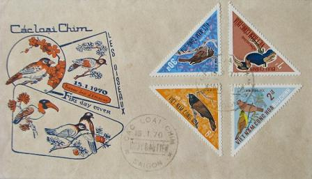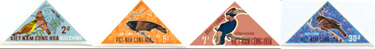 Các loại chim; gồm 04 mẫu (tem dị hình hình tam giác).